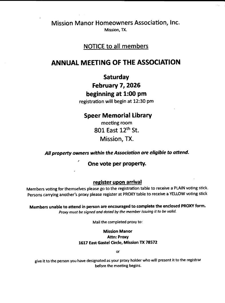 Annual Meeting packets, which include the Proxy form, will be mailed to all members on or about January 1st.