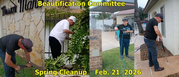 The Mission Manor Beautification Committee worked all morning February 21st cleaning the Common Area.